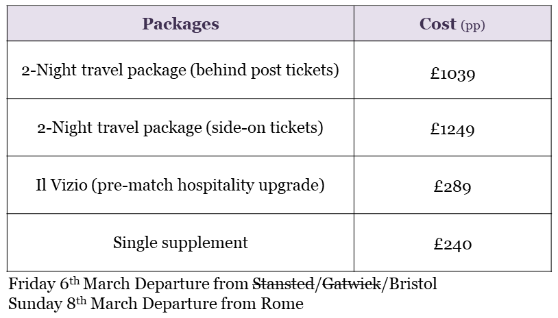 Included is a return charter flight (London Stansted , London Gatwick or Bristol), 2-nights’ accommodation at 4* Orazio Palace plus your choice of match ticket – side-on or behind the posts. We are also pleased to offer a superb pre-match VIP hospitality upgrade at Il Vizio.