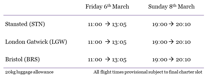 Our privately chartered planes from Stansted, London Gatwick & Bristol guaranteed grouped seating and total flexibility with final passenger names not required until January 2026.