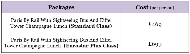 Explore the best of Paris, the City of Light, on this fantastic full-day Rail Tour that includes a three-course Champagne lunch at the Eiffel Tower. See Paris’s world-famous sights and iconic landmarks on a Hop-on Hop-off Sightseeing Bus Tour and enjoy stunning views of the Parisian waterfront on a 1-hour cruise along the River Seine.