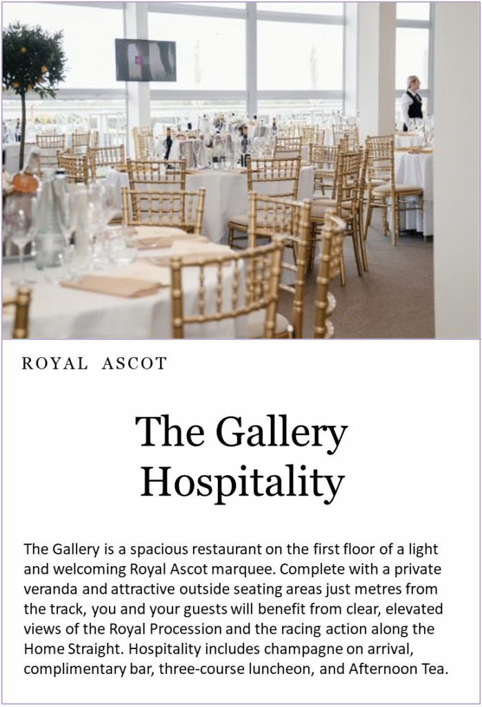 Spacious and filled with natural light, The Gallery offers the perfect blend of comfort, exclusivity, and excitement, making it one of the most sought-after new Royal Ascot hospitality options.