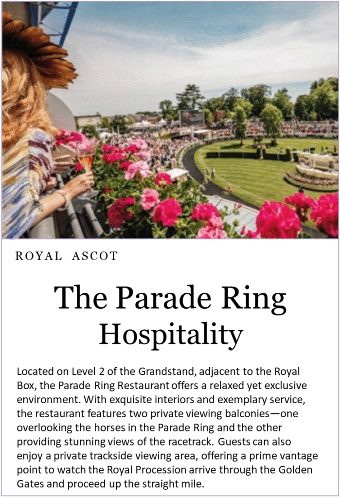 Perfect for racing enthusiasts, corporate entertaining, or an unforgettable social occasion, the Parade Ring Restaurant ensures you never miss a moment of the Royal Meeting. Guests also enjoy full access to the Queen Anne Enclosure, allowing you to soak up the vibrant atmosphere and explore the grandeur of this iconic event.