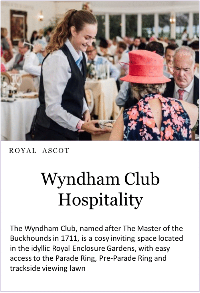 The Wyndham Club, named after The Master of the Buckhounds in 1711, is a cosy inviting space located in the idyllic Royal Enclosure Gardens, with easy access to the Parade Ring, Pre-Parade Ring and trackside viewing lawn.