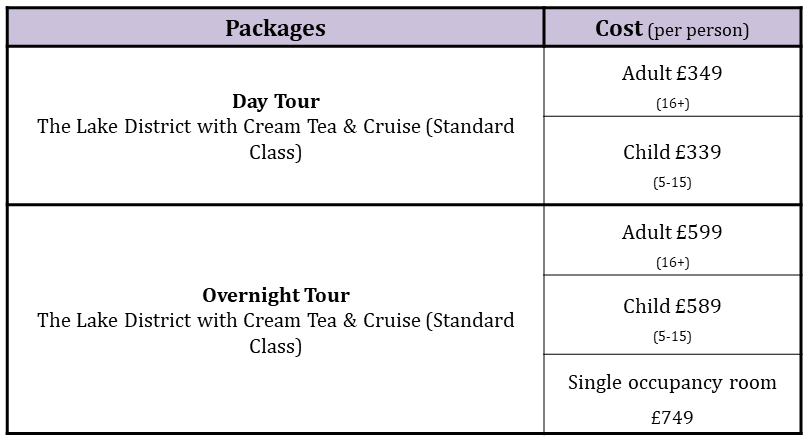 • Please note that the train journey is unescorted. On arrival at Oxenholme station in the Lake District, you will be met by your tour guide and start your Lake District guided tour
